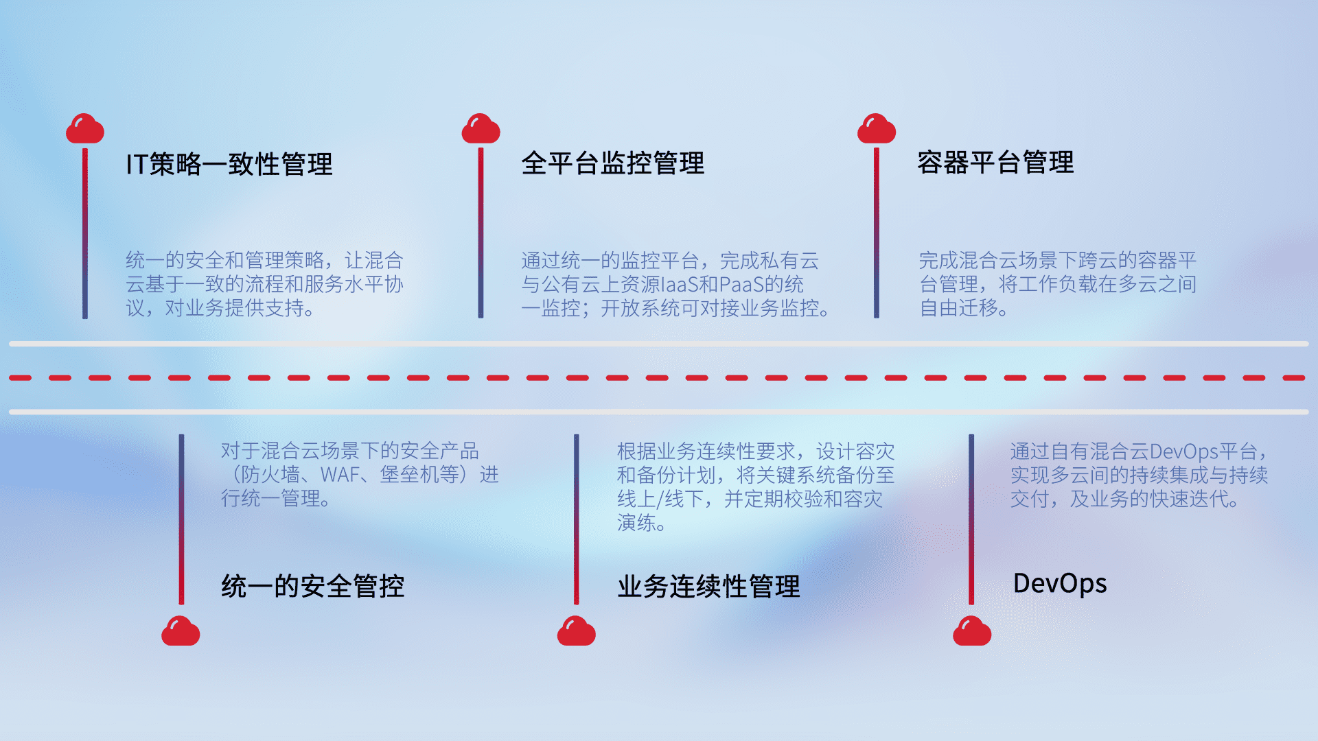 通过多云纳管,,以统一的资源数据模型把客户的云资源进行抽象和封装,,进而实现对多云资源的统一操作,,,,保障云资源管理的可靠性、、稳定性与可用性。。量身定制化运维内容,,配置、、、、开发运维、、补丁管理、、备份、、、监控、、、、认证和访问管理、、审计和日常巡检等,,保障在用云过程中的可靠度,,,稳定度以及高可用率。。。。