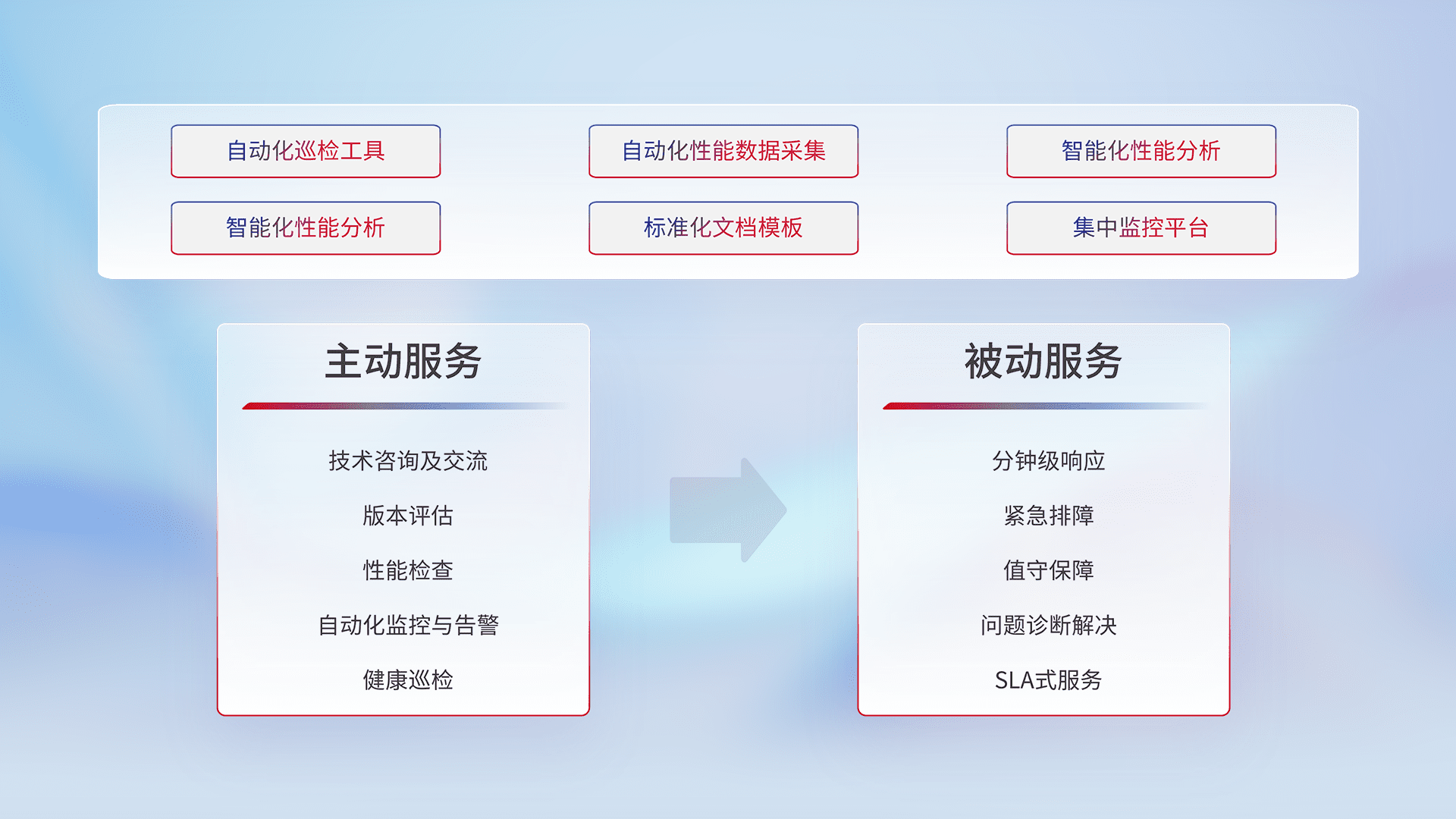 智能化工具和标准化文档,,,保障服务质量,,,,提供主动服务(包含技术咨询、、、版本评估、、、性能检查、、、自动化监控与告警、、健康巡检)和被动服务包含(分钟级响应、、紧急排障、、、值守保障、、问题诊断解决、、SLA服务)。。